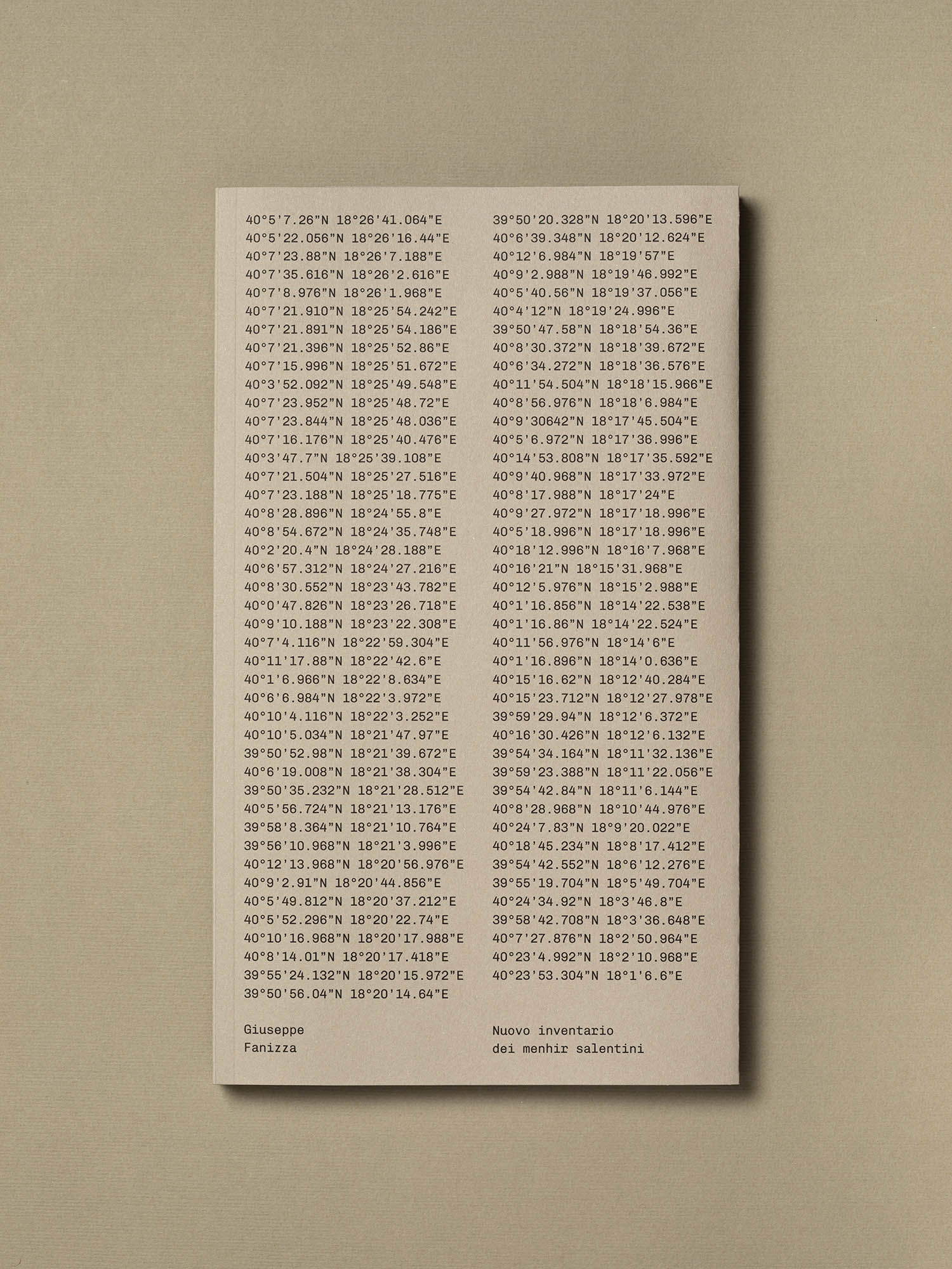 Il libro “Nuovo inventario dei menhir salentini” è stato pubblicato da ShowDesk/ a febbraio 2025 grazie al contributo del Ministero della Cultura – Direzione generale Educazione, ricerca e istituti culturali per la pubblicazione di volumi monografici inediti di rilevante interesse culturale e di ICCD – Istituto Centrale per il Catalogo e la Documentazione.